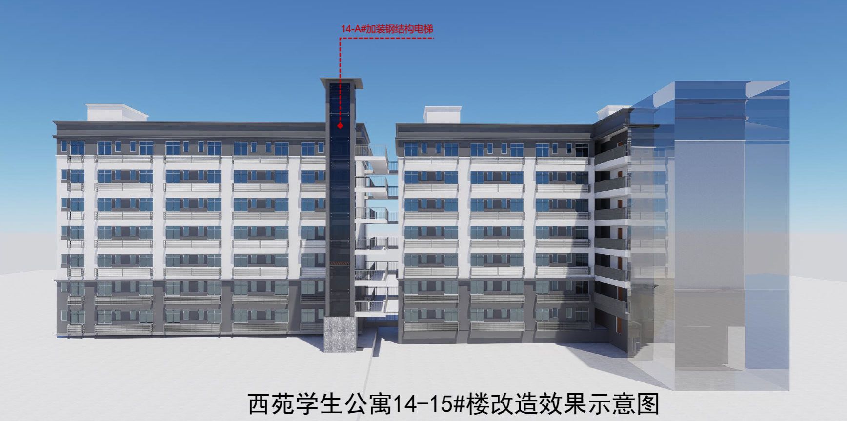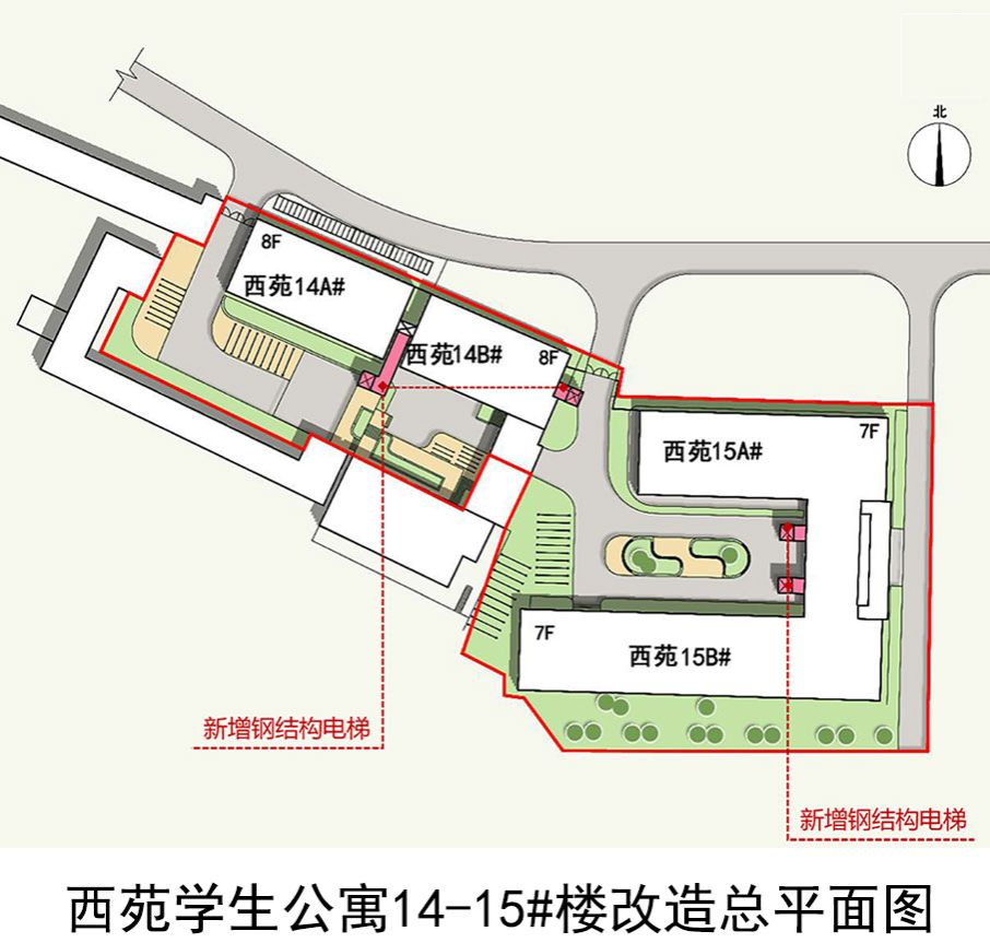 2.西苑学生公寓14-A#、14-B#、15-A#、15-B#楼各增加一部钢结构电梯;