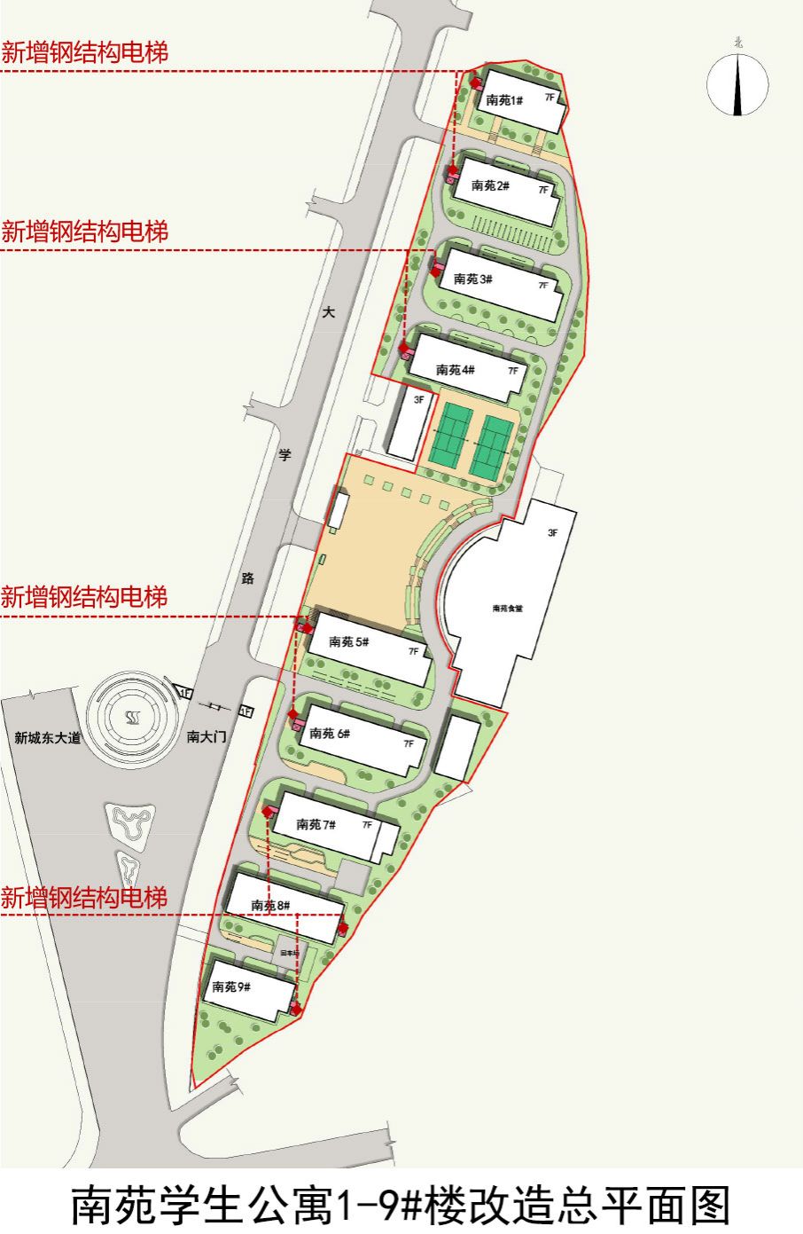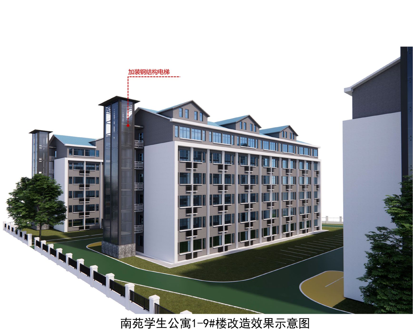 3.南苑学生公寓1-9#各增设一部钢结构电梯。