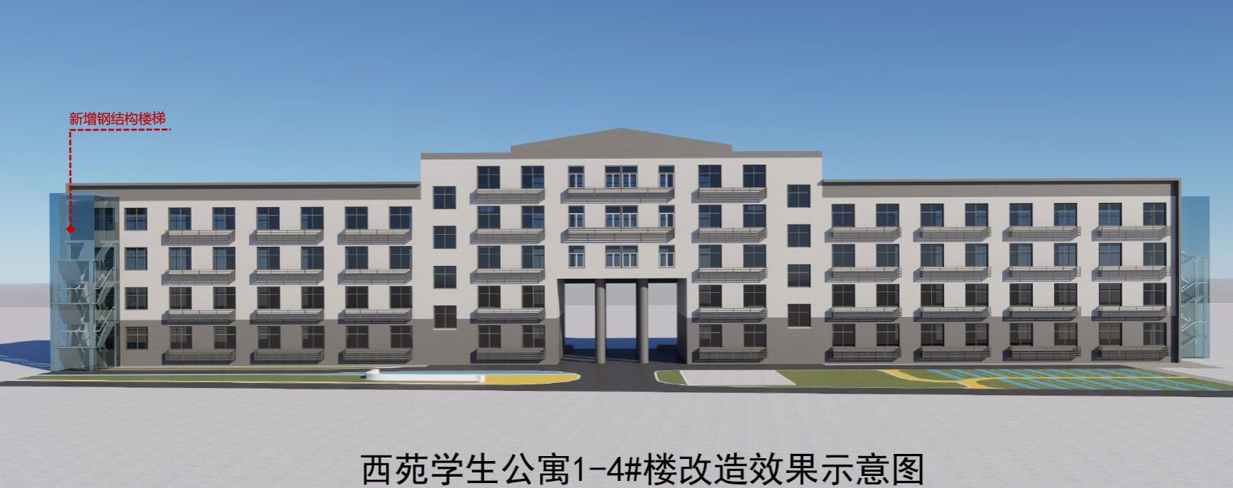 1.西苑学生公寓2#增设一部钢结构消防楼梯;